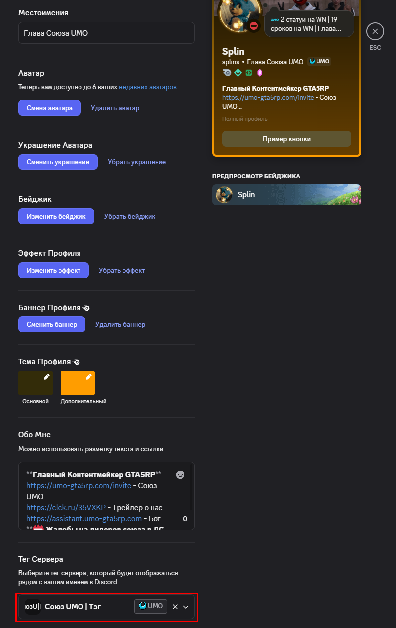 Для получения тэга UMO:1. Зайдите на специальный Discord-сервер по кнопке ниже. 2. Нажмите на шестеренку и перейдите в настройки Discord. 3. Нажмите слева на кнопку «Профили».4. Пролистайте вниз и выберите «Тэг сервера» UMO.5. Нажмите «Сохранить»